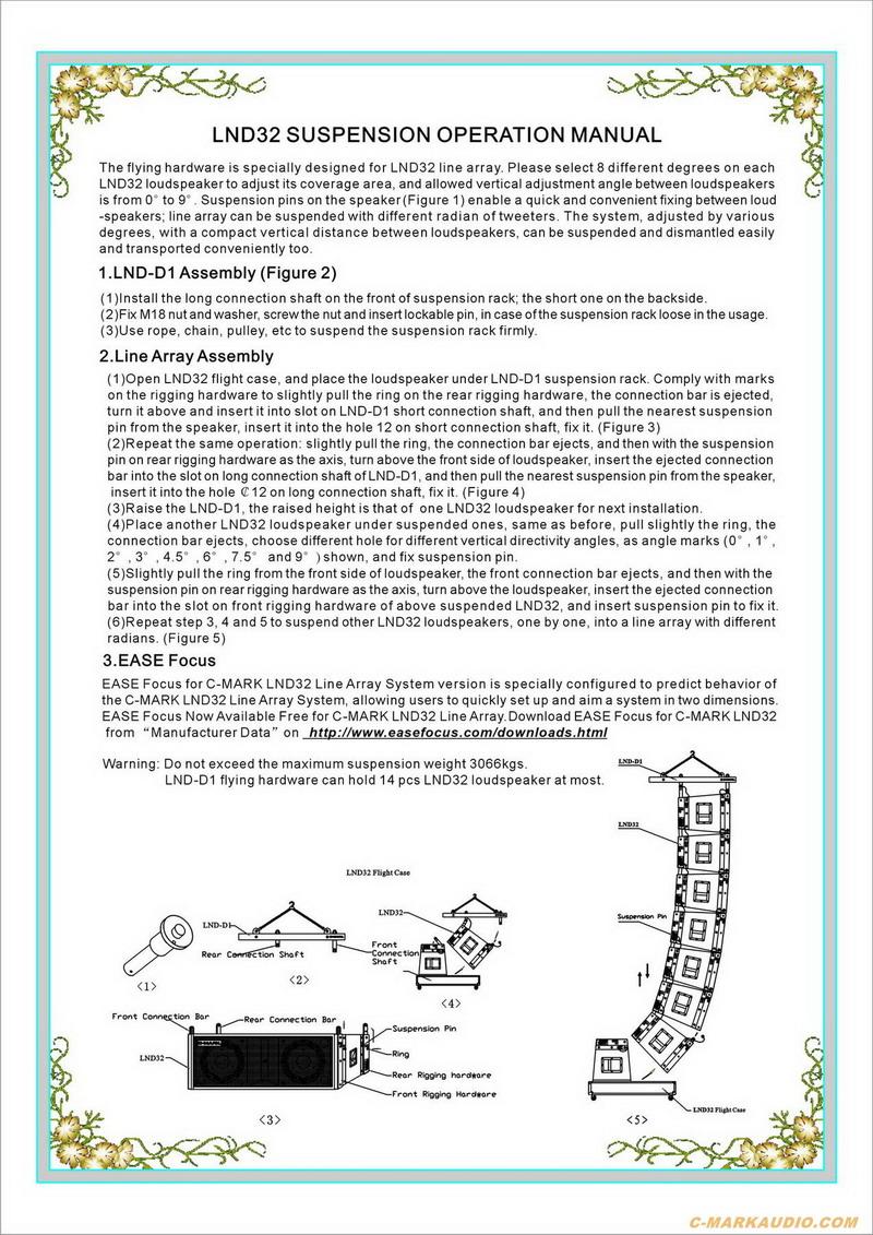 (1)Open LND32 flight case, and place the loudspeaker under LND-D1 suspension rack. Comply with marks on the rigging hardware to slightly pull the ring on the rear rigging hardware, the connection bar is ejected, turn it above and insert it into slot on LND-D1 short connection shaft, and then pull the nearest suspension pin from the speaker, insert it into the hole ?12 on short connection shaft, fix it. (Figure 3)