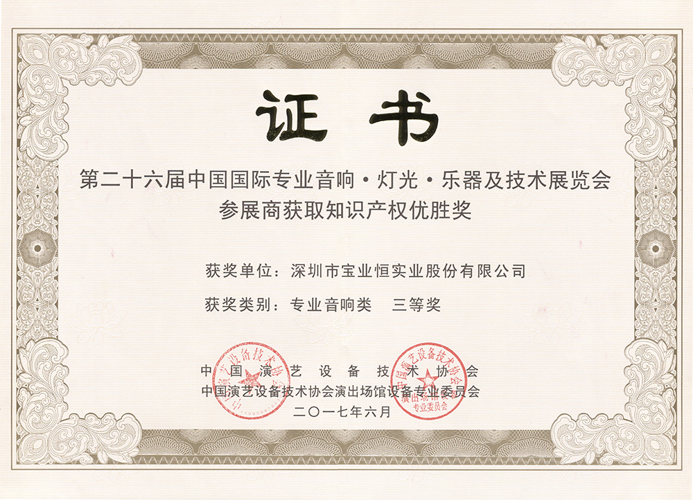 • 第二十六屆中國國際專業音響.燈光.樂器及技術展覽會知識產權優勝專業音響類三等獎