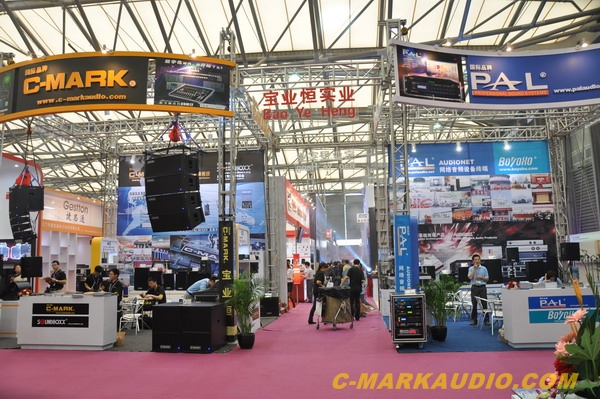 作為業(yè)內(nèi)翹楚,寶業(yè)恒公司一如既往地展現(xiàn)出大家風(fēng)范。從8號(hào)門邁步走進(jìn)W4號(hào)音響?zhàn)^,首先映入眼簾的就是寶業(yè)恒旗下C-MARK和PAL兩大知名音響品牌的6米高展位,兩個(gè)展位既按品牌不同體現(xiàn)相對(duì)獨(dú)立性又通過高懸在展位頂部結(jié)合處的“寶業(yè)恒實(shí)業(yè)”銘牌緊密相連。尤指一提的是,C-MARK的外拱形門頭和PAL的內(nèi)凹形門頭構(gòu)造出了一副極為逼真的太極圖,給所有觀眾以強(qiáng)烈的視覺沖擊力,同時(shí)寓示了寶業(yè)恒公司旗下品牌休戚與共、和諧發(fā)展的美好愿景。