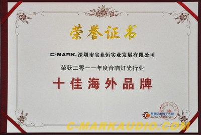 2012年3月1日,由慧聰音響燈光網發起主辦的2011年度第七屆音響燈光行業十佳評選頒獎典禮在廣州展期間落下帷幕。十佳海外品牌、十佳民族品牌、十佳競爭力品牌等九系列獎項揭曉。寶業恒旗下多個品牌榮膺十佳榜,其中一直在業內享有盛譽、深受業內人士垂愛的C-MARK再度被評選為“十佳海外品牌”,至此,C-MARK已連續七屆榮膺榜單。頒獎典禮上群星璀璨、寶業恒C-MARK可謂實至名歸。